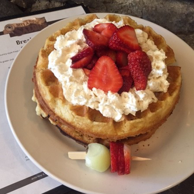 cornmeal waffle, sambayl chicken, housemade roasted garlic honey Sriracha aioli and housemade pickles